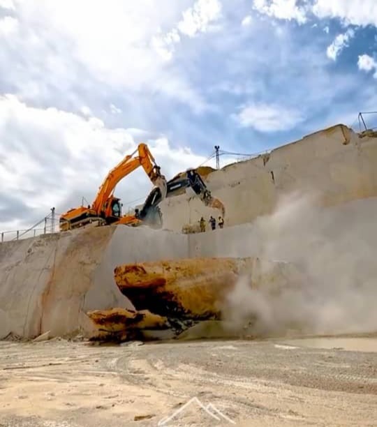 في هذه المرحلة، تُستخرج كتل الرخام والترافرتين الكبيرة بعناية باستخدام تقنيات **المناشير السلكية** والحفر المتقدمة.